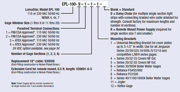 Illuminators are made in single and double section styles for Jerguson Series 300L, 20, 32 and L-10 gages. Double sections require only one lamp for illumination of two gage sections. They can be adopted for use of Non-Frosting Transparent Gages, and Reflex Gages. The EPL-56 uses a medium base 58 watt bulb.