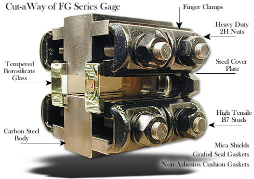 FG Series Gages provide wide body construction for added strength and rigidity. Tempered flat glass composition of premium quality to resist thermal shock. All glass is tested for surface trueness prior to assembly and is protected with a high quality mica shield for steam applications. All models feature finger-clamps which impart a uniform, perpendicular load across the glass surface, assuring gasket tightness. This design allows easy dismantling for cleaning and servicing. A window slot, 5/8" wide, provides high visibility gage reading. For many Prismatic Gages installations, Water gage illuminators are recommended to improve gage readability. |
