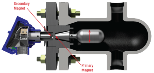 primary magnet on the float rod drives the secondary magnet located inside the switch housing. The secondary