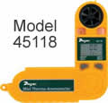 Model 45118 Pocket Wind Meter. The rotating vane anemometer is constructed with light weight, strudy plastic impeller which spins on high precision jewel bearings. The impeller assembly is easily replaceable in the event of damage or wear. Wind speed, average wind speed, maximum wind speed, temperature, and windchill can quickly be viewed on the 4 digit LCD display in user selectable measuring units.