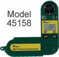 Model 45158 Pocket Weather Meter. Measuring modes and display units can be changed at any time. All functions are controlled with two buttons. The 45158 also displays maximum, average, and current wind speed in knots, meters per minute, and Beaufort scales. Quickly select temperature measurement in °F or °C. The compact, rugged weather meter is water resistant, and the unit also features automatic shut-off. Similar to the standard wind meter, the 45158 also offers data hold, detailed instruction manual, protective plastic housing, tripod-mounting connection, and a water resistant housing that floats. Accessories include a spare battery and a 43" lanyard.